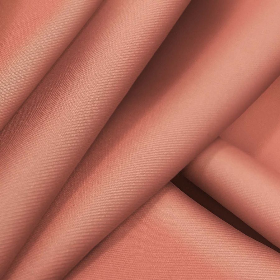 La tela base es la Lycra Reciclada - Recycled de 190 gr/m2, compuesta por un 85% de poliéster y un 15% de elastano. El color liso impreso es de un rojo pastel, con un contenido de 3 de tinta cyan, 63 de tinta magenta, 55 de tinta yellow y 0 de tinta black en su CMYK. El color secundario es un tono cálido y suave, que combina perfectamente con tonos neutros como el blanco, el gris y el beige, así como con tonos más cálidos como el amarillo y el naranja.