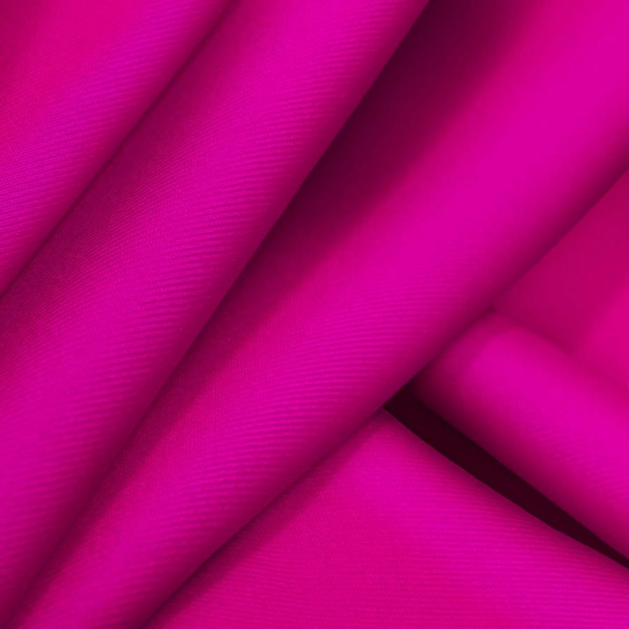 La tela base es Lycra Reciclada - Recycled de 190 gr/m2, compuesta por 85% de poliéster y 15% de elastano. El color liso impreso es Rosa Mexicano, con un CMYK de 2 98 6 0. Este rosa vibrante y cálido es el resultado de la combinación de tonos magenta y amarillo con un toque de cian, lo que le da un matiz anaranjado. El color combina perfectamente con tonos de la gama del amarillo, naranja y rojo.