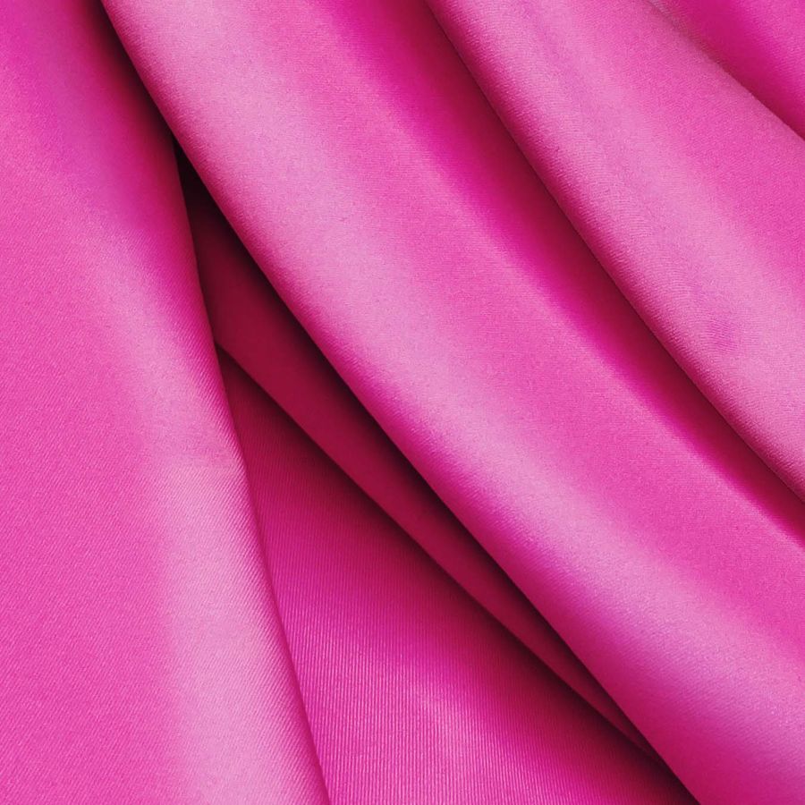 La tela base es Lycra Reciclada - Recycled de 190 gr/m2, con una composición del 85% de poliéster y 15% de elastano, lo que le otorga una textura suave y elástica. El color liso impreso es un rosa de tonalidad Rosé Bonbon, con un CMYK de 0 83 0 0 y una tinta magenta muy pronunciada. Se puede combinar con tonalidades claras, como el blanco o el gris, así como con otros tonos de rosa.