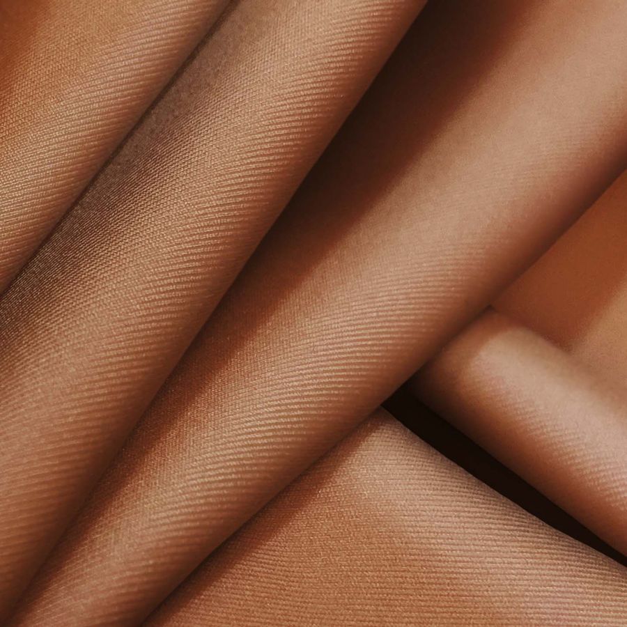 La tela base, Lycra Reciclada - Recycled, es una lycra compuesta por un 85% de poliéster reciclado y un 15% de elastano con un gramaje de 190 gr/m2 y un ancho de 150 cm. Su color liso impreso es un Marrón Coñac que se obtiene mediante la combinación de tintas Cyan, Magenta, Yellow y Black, con un CMYK de 29 63 75 28. Este color secundario es un tono cálido y elegante con un toque de brillo y se combina muy bien con otros tonos marrones y dorados.