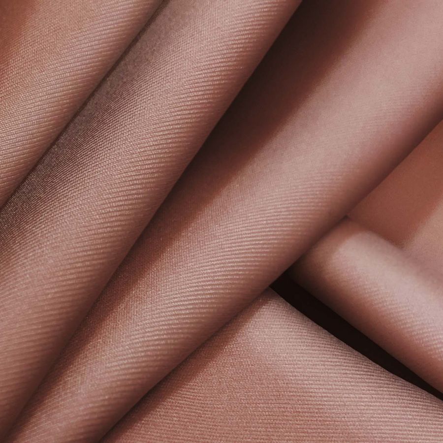 La tela base de este tejido es Lycra Reciclada - Recycled de 190 gr/m2, con una composición de 85% poliéster y 15% elastano. Tiene un ancho de 150cm y un gramaje de 190 gr/m2. El color liso impreso es un Marrón Cobrizo, con un CMYK de 30 58 53 27, lo que nos da un tono cálido y terroso. Este color combina muy bien con tonos tierra, dorados y marrones oscuros.