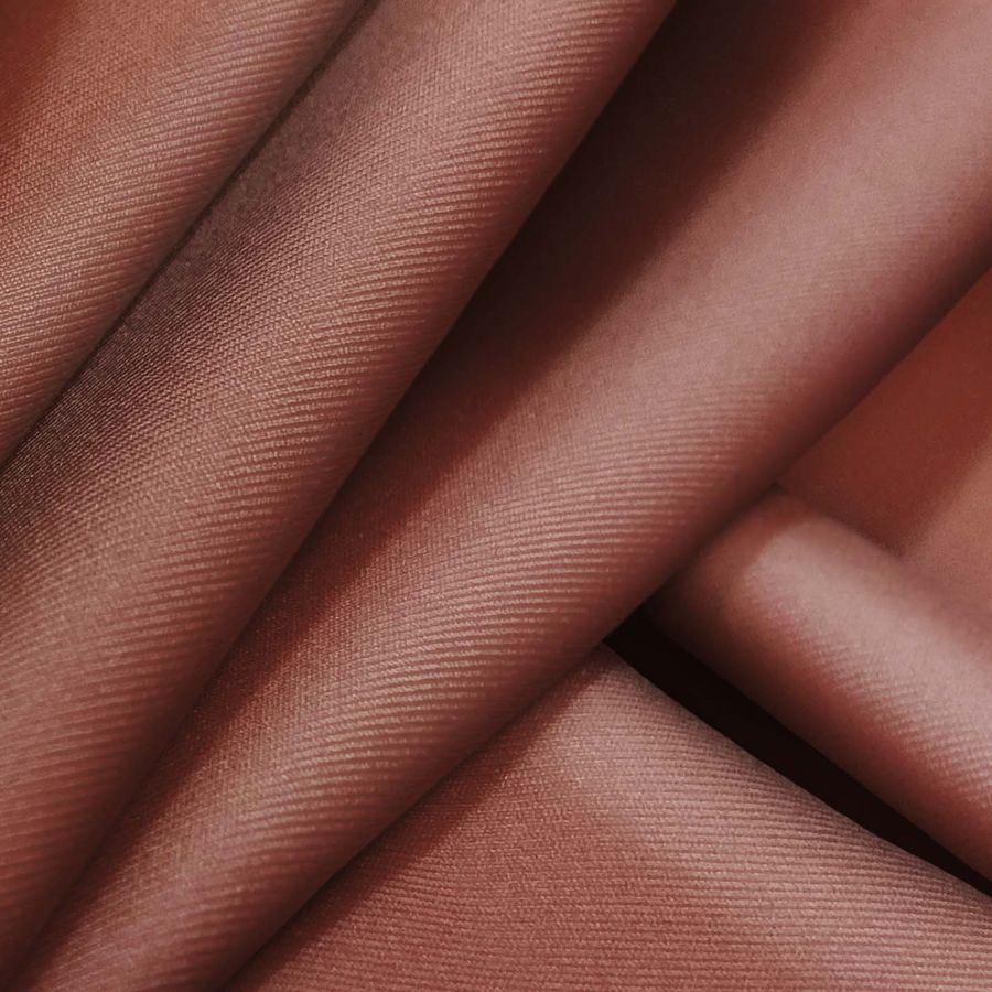 La tela base es Lycra Reciclada - Recycled de 190 gr/m2, compuesta por un 85% poliéster y un 15% elastano, de textura suave y elástica. El color liso impreso en la tela es una combinación de marrón y rojo veneciano con un CMYK de 33 69 65 39. Este color secundario aporta una sensación de calidez y pasión, ya que combina la fuerza y la energía del rojo con la estabilidad y la confianza del marrón. También combina bien con colores cálidos como el amarillo, naranja y verde oliva, y con neutros como el blanco y el gris.