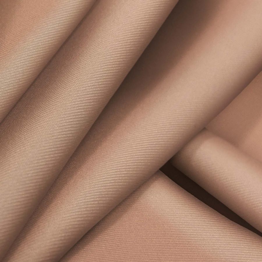 La tela base de este tejido es la Lycra Reciclada - Recycled de 190 gr/m2. El color liso impreso es de tono marrón terracota, con una mezcla de tinta cyan del 20%, tinta magenta del 47%, tinta yellow del 52% y tinta black del 9%. Este color representa la elegancia y la sencillez, además de aportar calidez y cercanía al entorno. El marrón terracota es un color secundario que combina muy bien con tonos amarillos, verdes y tierra.
