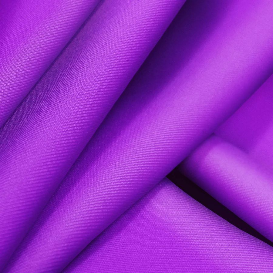 La tela base es la Lycra Reciclada - Recycled de 190 gr/m2, compuesta por un 85% de poliéster y un 15% de elastano. Su ancho es de 150 cm y su gramaje de 190 gr/m2. El color liso impreso en esta tela es el morado/purpura X11, cuyo CMYK es 70 81 0 0. Este color evoca misterio, creatividad y elegancia, y se combina muy bien con tonos grisáceos y azules para crear un look moderno y sofisticado. Cabe destacar que la tela está impresa con el color liso a una sola cara por impresión digital textil.