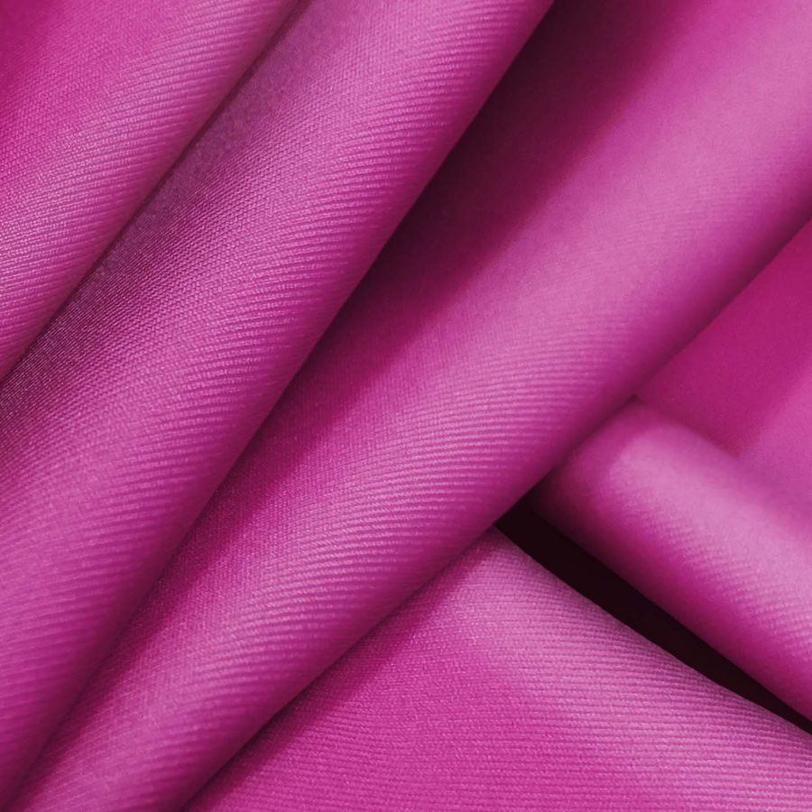 La tela base es Lycra Reciclada - Recycled de 190 gr/m2 con composición de 85% poliéster y 15% elastano. El color liso impreso es un morado con reflejos violeta rojizo medio, con una composición CMYK de 28 90 6 0. Es un color intenso y vibrante que se complementa muy bien con otros tonos morados y rosas. El tejido está impreso con el color liso a una sola cara por impresión digital textil.