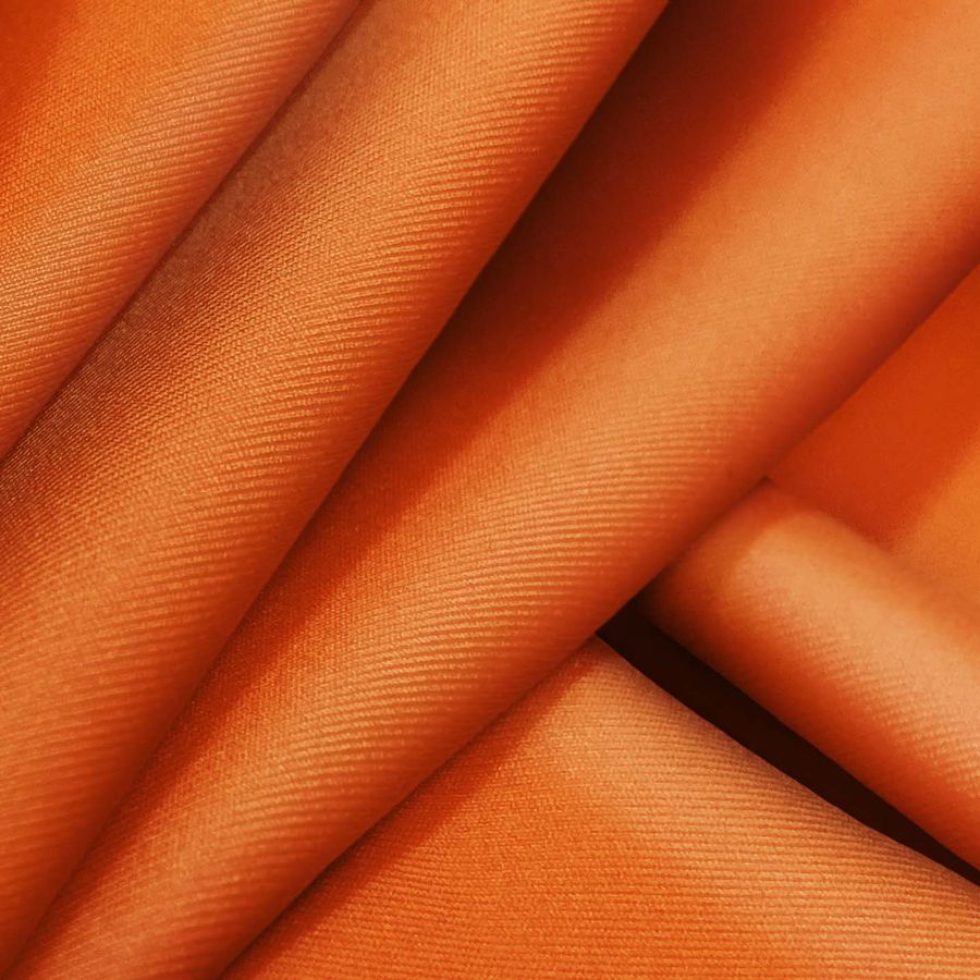 La tela base es Lycra Reciclada - Recycled de 190 gr/m2, compuesta por un 85% de poliéster y un 15% de elastano, con una anchura de 150 cm. Su color liso impreso tiene un CMYK de 1-78-100-0, que se traduce en un color naranja coquelicot vibrante y llamativo. Este color secundario simboliza la pasión, el deseo y la calidez, transmitiendo energía y vitalidad. El color naranja coquelicot se combina especialmente bien con tonos del mismo espectro, como rojos y amarillos, así como con el verde y el azul para contrastes elegantes.