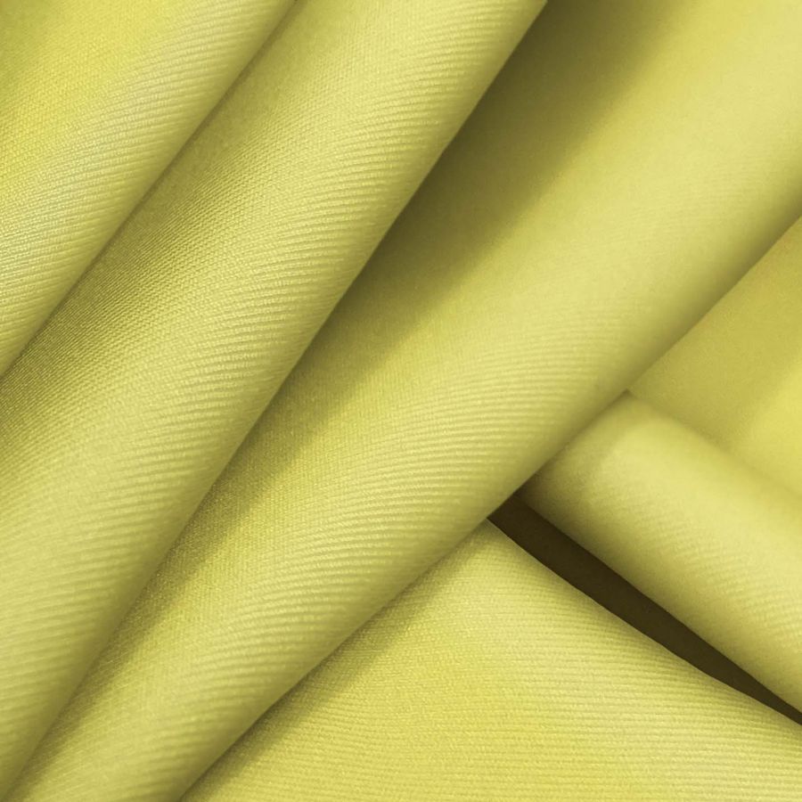 La tela base, Lycra Reciclada - Recycled, es un tipo de Lycra compuesta por 85% Poliéster y 15% Elastano que cuenta con un gramaje de 190 gr/m2 y un ancho de 150 cm. Su color liso impreso, Amarillo Níquel-Titanio, tiene una combinación CMYK de 5 0 70 0, lo que representa una tonalidad amarilla con un toque entre grisáceo y plateado. Este color se combina especialmente bien con tonos neutros, como grises y blancos, así como con su tono complementario, el morado. Es importante destacar que la tela está impresa con este color liso a una sola cara por impresión digital textil.