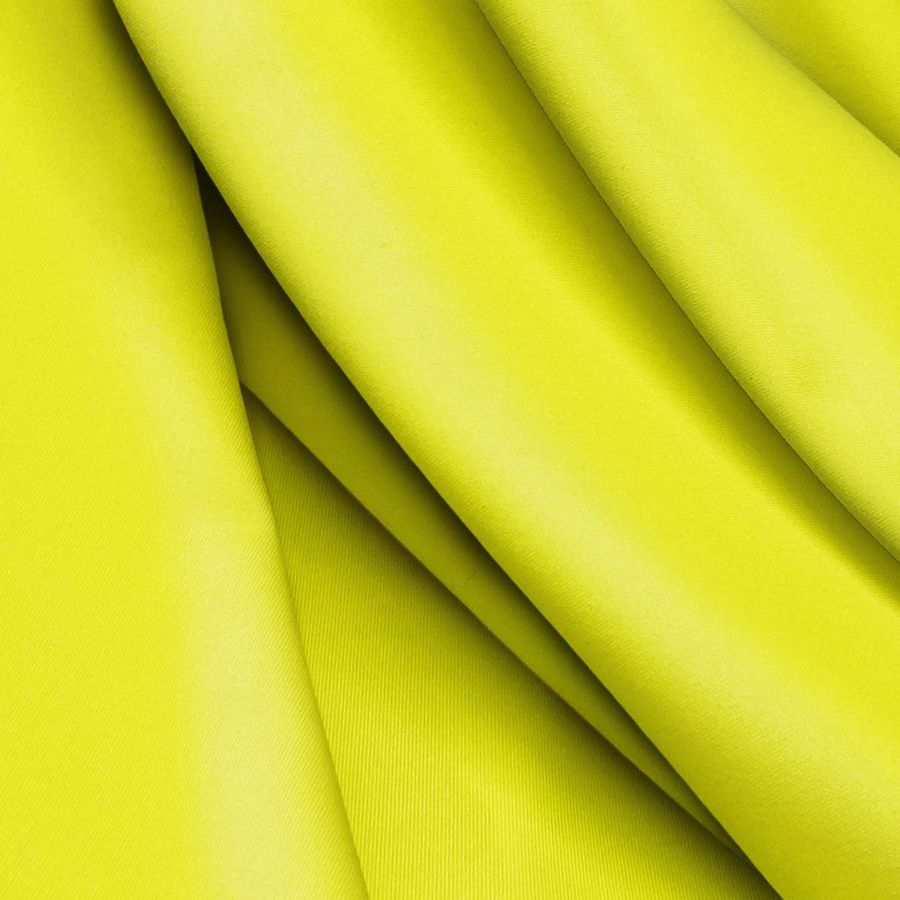 La tela base es Lycra Reciclada - Recycled de 190 gr/m2, compuesta por un 85% de poliéster y un 15% de elastano, con 150 cm de ancho y un gramaje de 190 gr/m2. El color liso impreso es Amarillo Sol, que se logra con 12 de tinta Cyan, 0 de tinta Magenta, 93 de tinta Yellow y 0 de tinta Black, con un CMYK de 12 0 93 0. Este color primaveral combina perfectamente con tonos blancos, negros y grises, resaltando así su tonalidad.