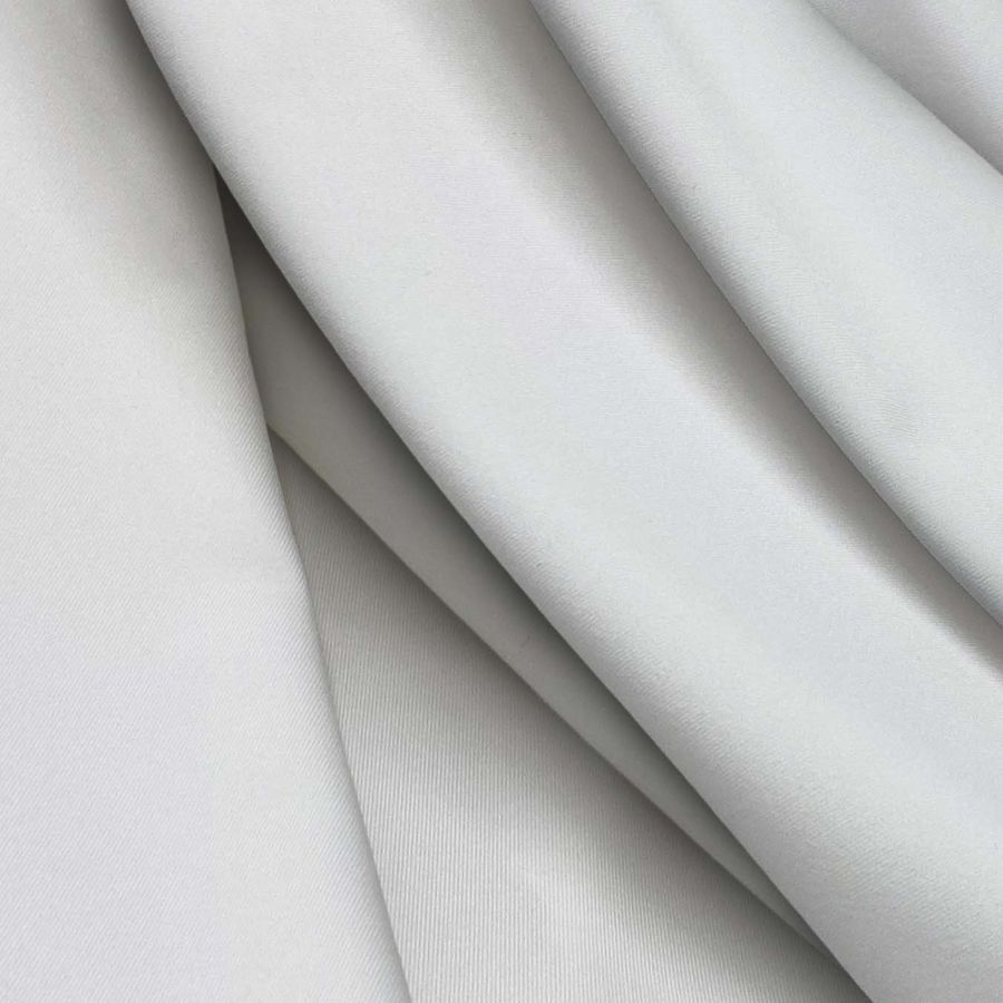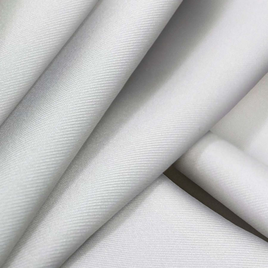 La tela base es Lycra Reciclada - Recycled de 190 gr/m2, compuesta por 85% poliéster y 15% elastano, con una anchura de 150 cm y certificada por GRS como sostenible y reciclada. El color liso impreso tiene un tono base blanco de zinc, con una mezcla de tinta cyan y magenta en una proporción de 2 y 1 respectivamente, sin presencia de tinta amarilla ni negra en el proceso de impresión. El resultado es un color secundario suave y elegante, que combina especialmente bien con tonalidades medias y claras, como beige, rosa claro o azul cielo. Es importante destacar que este tejido está impreso con el color liso a una sola cara por impresión digital textil, lo cual significa que es un tejido que no está tintado, sino impreso en una sola cara.