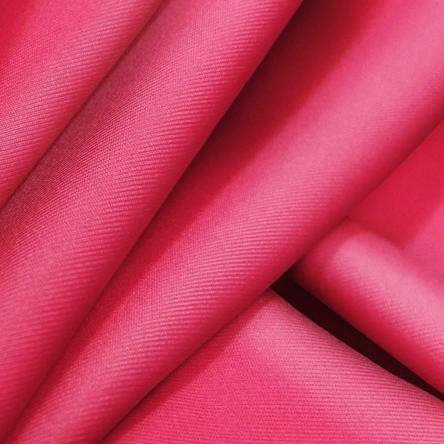 La tela base de este tejido es Lycra Reciclada - Recycled de 190 gr/m2, compuesta por 85% POLIÉSTER y 15% ELASTANO, con un gramaje de 190 gr/m2 y ancho de 150 cm. El color liso impreso en esta tela es Radical Red, que se define por una tinta magenta de 87 y una tinta yellow de 44, con un CMYK de 0 87 44 0. Este color despliega una vibrante energía que lo hace atractivo y alegre. Combina de manera perfecta con tonalidades tierra y azul, generando interesantes contrastes.