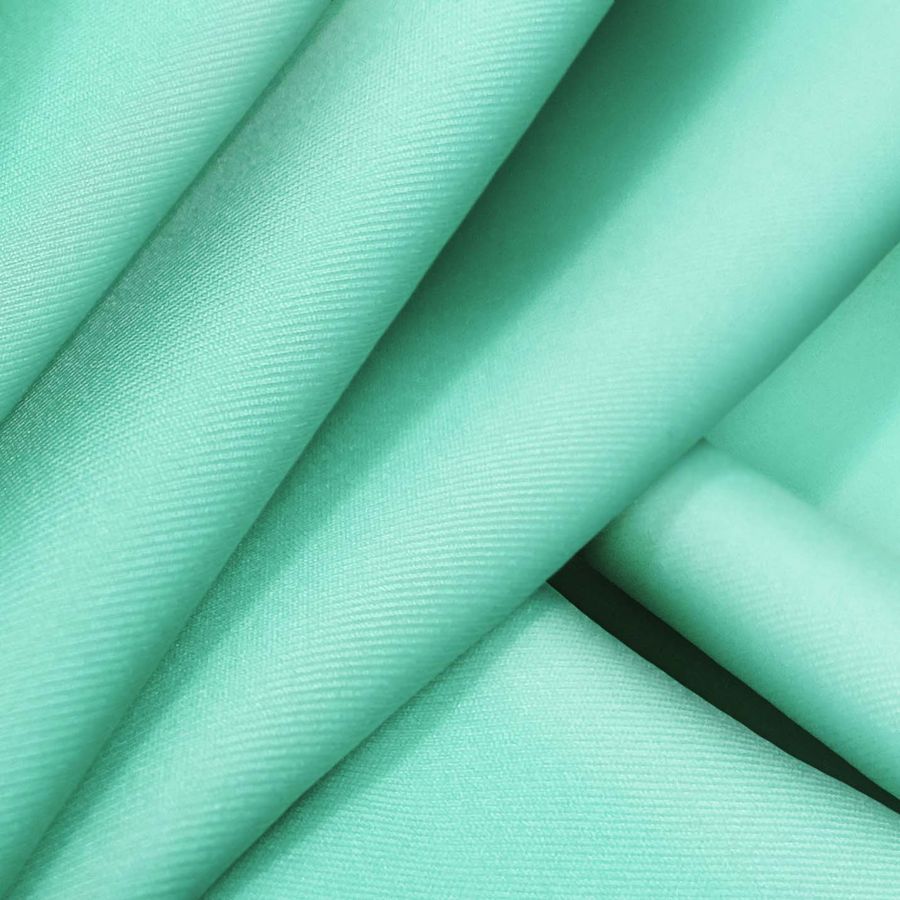 La Lycra Reciclada - Recycled de 190 gr/m2 es una tela de lycra compuesta por 85% poliéster y 15% elastano. De color verde aguamarina, el CMYK de la tinta utiliza 46% de cian y 32% de amarillo. Este color se combina especialmente bien con tonos azules y grises. La tela está impresa con el color liso a una sola cara por impresión digital textil.