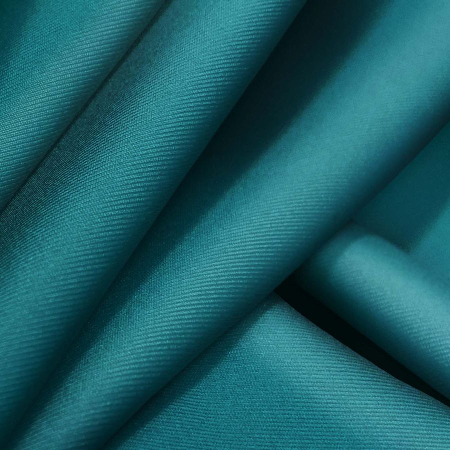 La tela base es la Lycra Reciclada - Recycled de 190 gr/m2, con una composición de 85% poliéster y 15% elastano, de una textura suave y elástica. El color liso impreso es un Azul del Golfo, cuyo CMYK es 88 40 45 32 y está compuesto principalmente por tintas cyan y amarillas. Este color transmite calma y serenidad, sugiriendo el mar y la naturaleza.