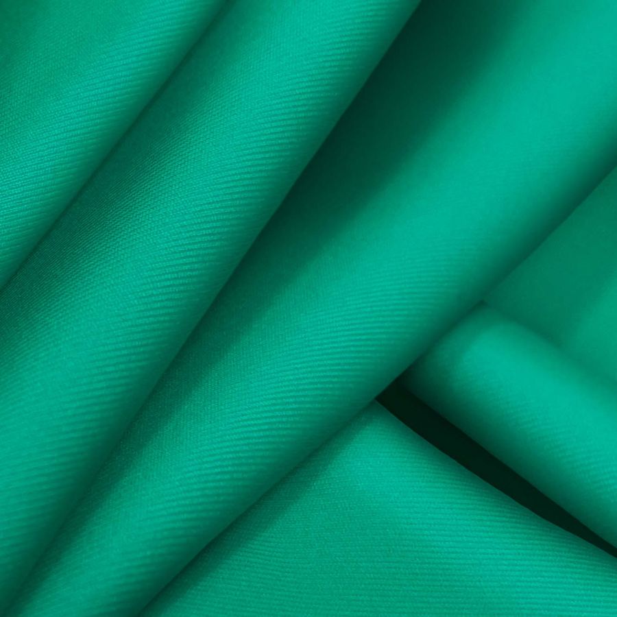 La tela base es Lycra Reciclada - Recycled de 190 gr/m2 en color liso Azul Esmeralda, con una combinación de tinta Cyan 81, Magenta 13, Yellow 65 y Black 1, reflejando en su CMYK un tono turquesa verdoso intenso. Esta tela es suave y elástica, resistente al cloro y cuenta con un UPF de protección muy alta de 50+. La Lycra es conocida por su elasticidad y flexibilidad, lo que la hace ideal para su uso en trajes de baño y prendas deportivas. El color Azul Esmeralda es vibrante y único, y se combina especialmente bien con tonos neutros como blanco, gris y negro, así como con tonos azules más oscuros y morados.