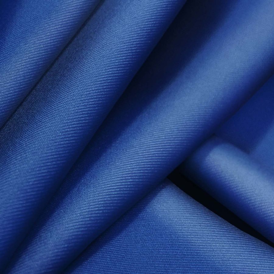 La tela base es Lycra Reciclada - Recycled de 190 gr/m2, una tela de composición 85% poliéster y 15% elastano de tacto suave y elástico. El color liso de la tela es un intenso Azul Xenón con un CMYK de 100 84 22 5, lo que indica una alta presencia de cian y magenta y una menor presencia de amarillo y negro. Este color secundario es muy versátil y combina muy bien con tonos tierra, grises y tonalidades opacas. Es un color que inspira estabilidad, fiabilidad y seguridad. La tela está impresa con el color liso a una sola cara por impresión digital textil, lo que significa que no es un tejido tintado, sino impreso por una sola cara.