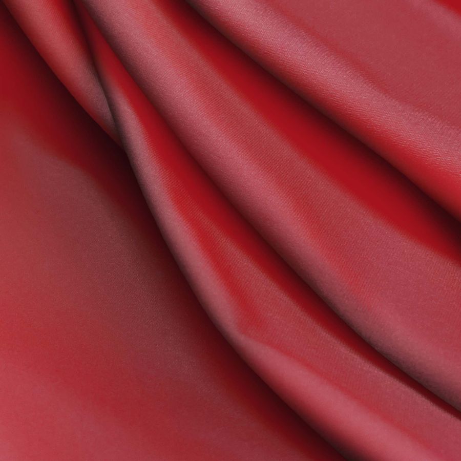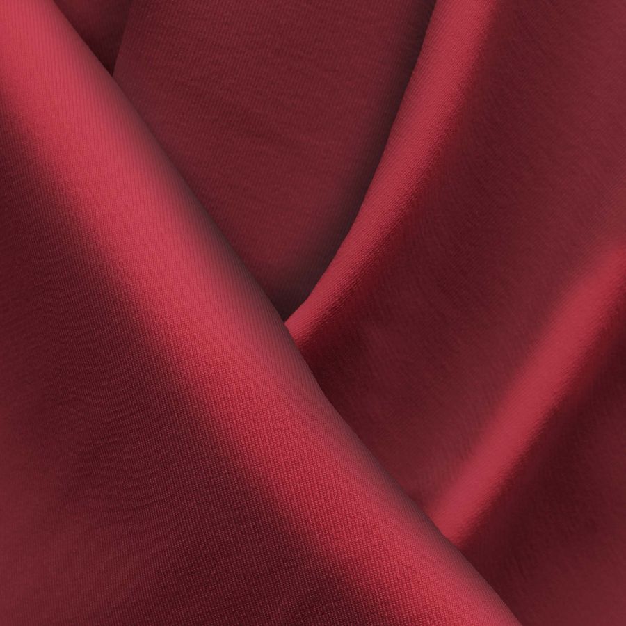 La tela base es una Lycra Reciclada - Seal de 230 gr/m2, compuesta en un 75% de poliéster y un 25% de elastano. El color liso impreso es Rojo Borgoña, representado por la combinación de las tintas Cyan 32, Magenta 99, Yellow 75 y Black 45 en un modelo CMYK 32 99 75 45. Este color secundario es intenso y vibrante, otorgando un aspecto seductor y elegante a la prenda. Combina especialmente bien con tonos blancos y negros para dar un contraste potente y atrevido.