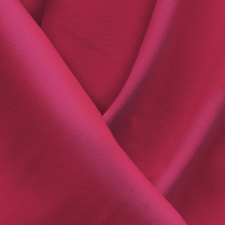 La tela base es Lycra Reciclada - Seal de 230 gr/m2, una lycra formada por 75% de poliéster y 25% de elastano. El color liso impreso es un Borgoña claro con un CMYK de 0 85 36 0. Este color se asemeja a una combinación de rojos profundos, morados y toques rosados. Combina a la perfección con colores suaves y neutros como blanco, marfil y arena, pero también con colores más vibrantes como los amarillos cálidos y los verdes intensos.