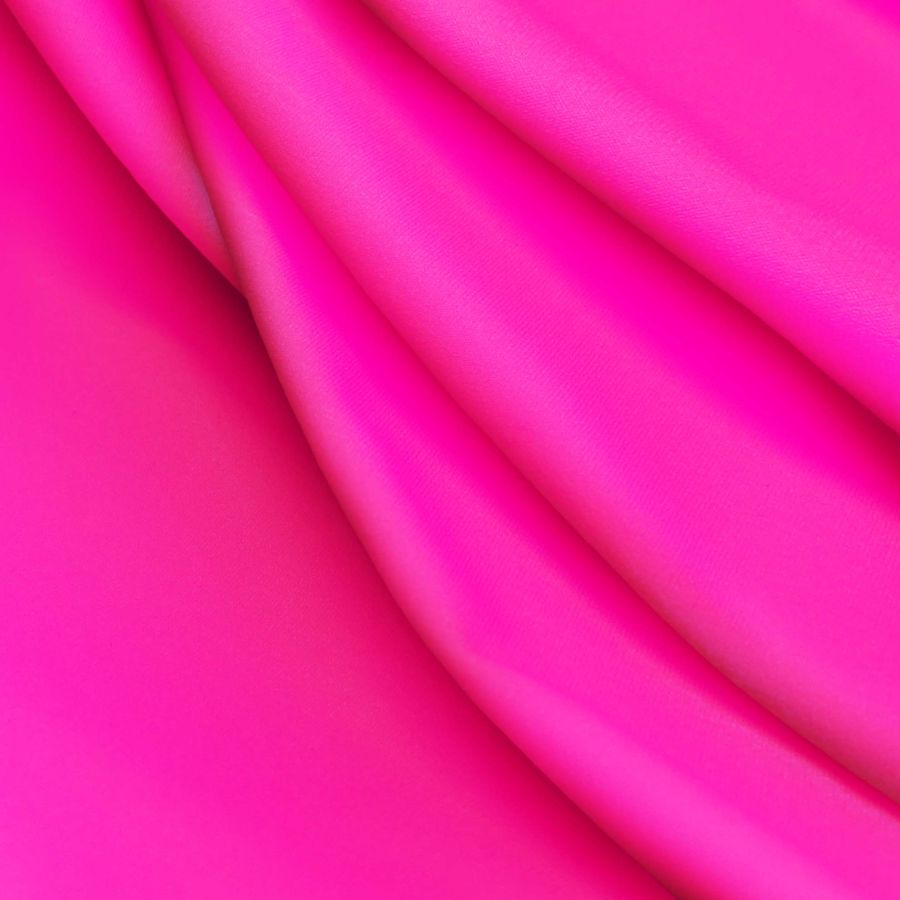 La tela base es Lycra Reciclada - Seal de 230 gr/m2, con una composición de 75% poliéster y 25% elastano. Su ancho es de 150 cm y es resistente al cloro, con un factor de protección UV muy alta 50+. El color liso impreso es un rosa brillante que se produce a través de la tecnología de sublimación (poliéster), y está compuesto de 93% de magenta, 8% de amarillo y 0% de cian y negro. Este color secundario es predominante en la mezcla de colores y combina especialmente bien con tonalidades suaves de rosa y morado.