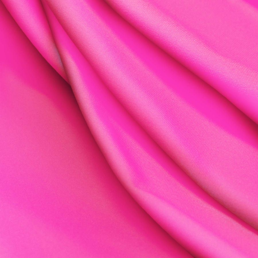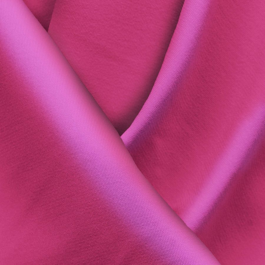 La tela base es Lycra Reciclada - Seal de 230 gr/m2, con una composición de 75% poliéster y 25% elastano de textura elástica y tacto suave. El color liso impreso es rosa cerise, compuesto por tinta magenta en un 87%, tinta yellow en un 12% y sin tinta cian ni negra. Este color evoca la feminidad, la pasión y la vitalidad, y combina perfectamente con tonos oscuros como el negro o gris, y tonos neutros como el blanco o el crema. Hay que tener en cuenta que la tela está impresa con el color liso a una sola cara por impresión digital textil.