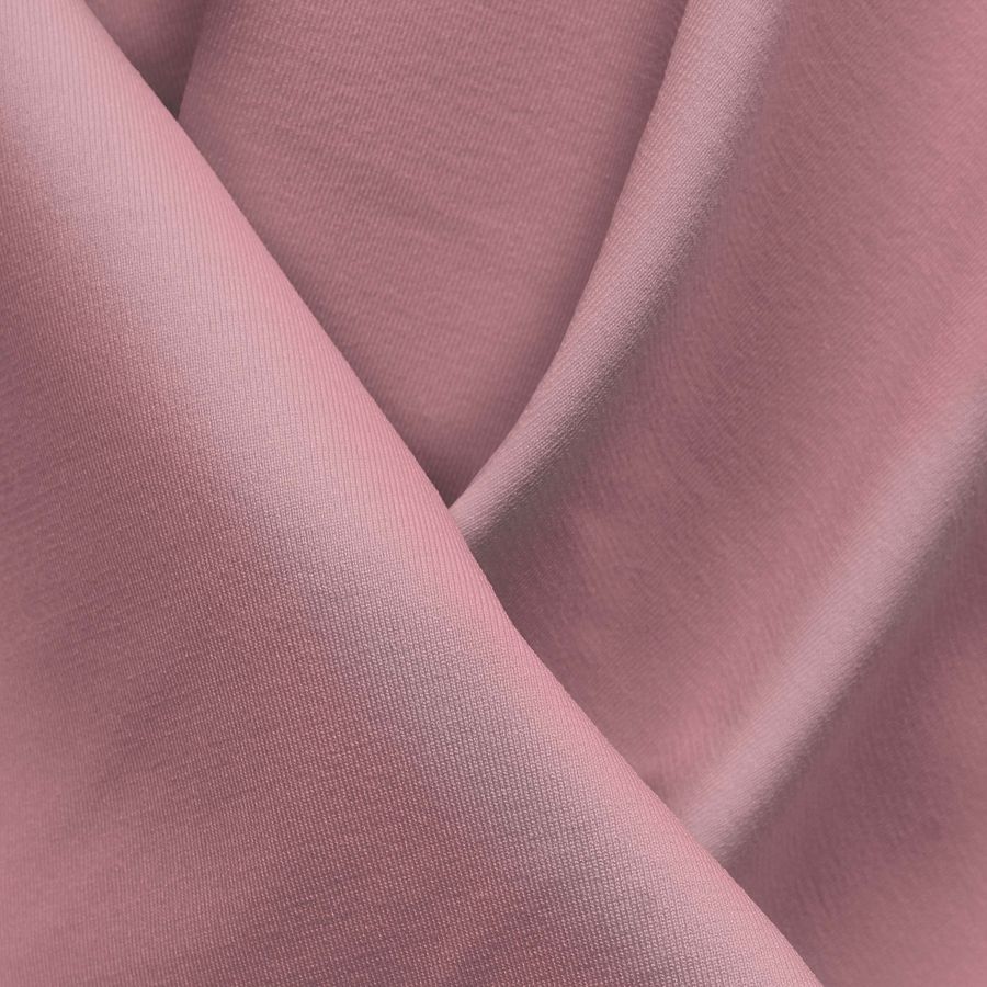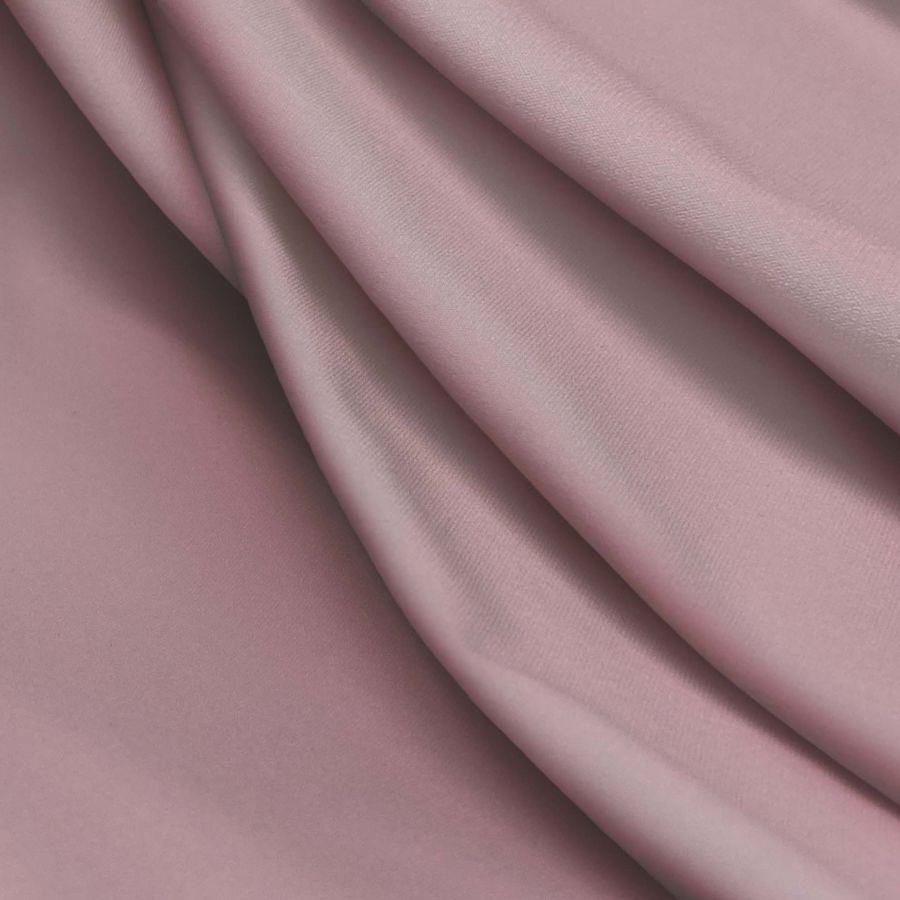 La tela base es una Lycra Reciclada - Seal de 230 gr/m2 con una composición de 75% POLIÉSTER y 25% ELASTANO, con un ancho de 150 cm, resistente al cloro y con protección UV Muy Alta 50+. El color liso impreso es un rosa claro (CMYK: 0 39 13 0) y está impreso a una sola cara por impresión digital textil. La tela es elástica y tiene una textura suave al tacto. El color secundario del rosa claro se desglosa en una tonalidad magenta y un toque de amarillo que le da un tono más cálido. Este color combina especialmente bien con tonalidades de gris y azul.