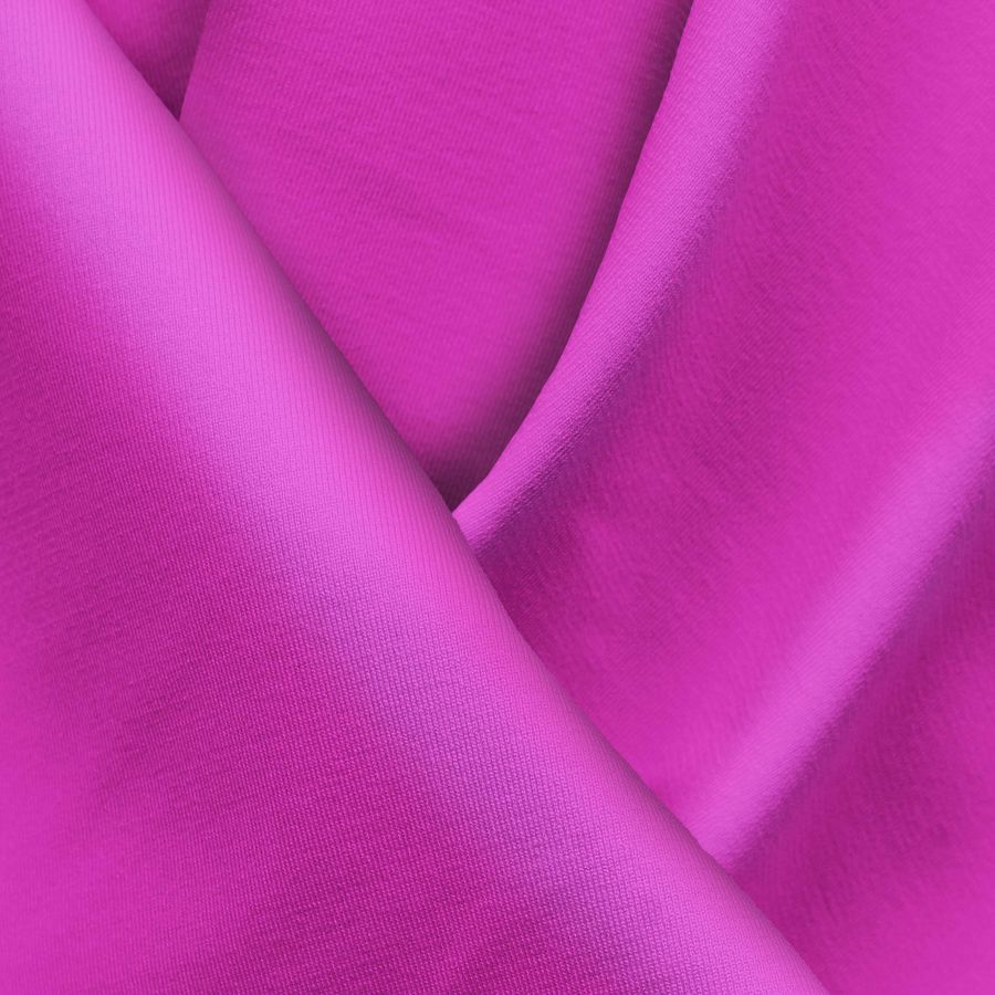 La tela base es Lycra Reciclada - Seal de 230 gr/m2, compuesta por 75% poliéster y 25% elastano, con una anchura de 150 cm. Su color liso es un Rosa Deslumbrante Razzle, con un CMYK de 23 79 0 0, lo que aporta un tono vibrante y alegre. Este color secundario combina perfectamente con tonos blancos, grises y negros, creando un contraste ideal y un acabado elegante.
