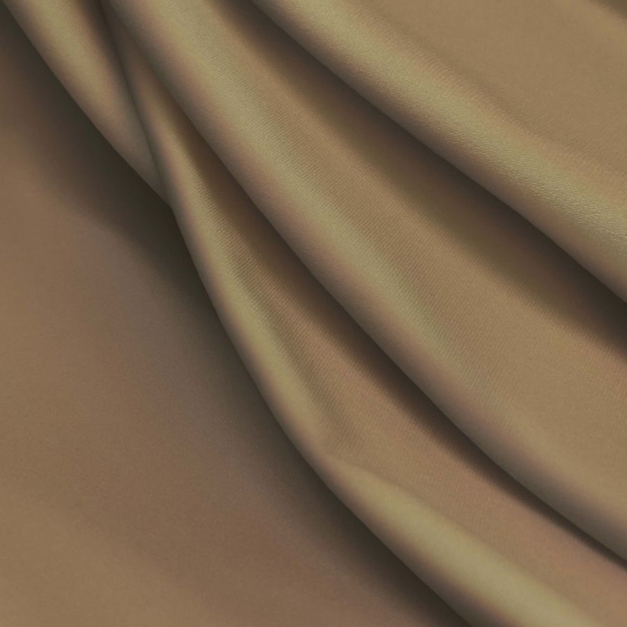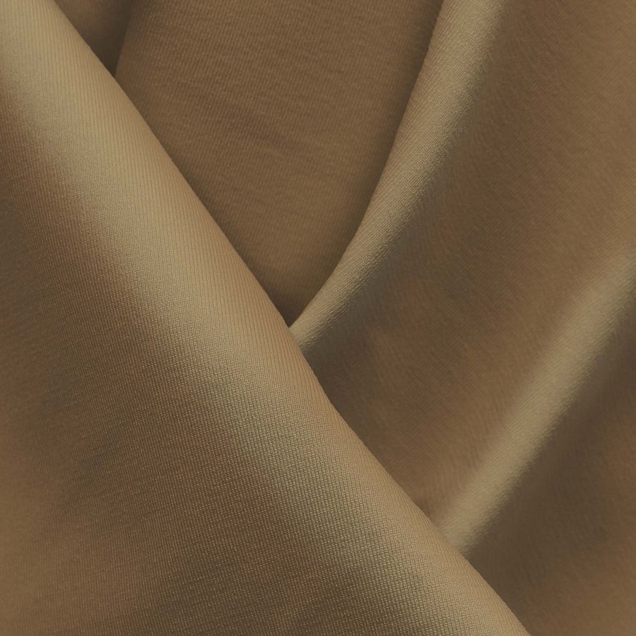 La tela base, Lycra Reciclada - Seal de 230 gr/m2, es una lycra compuesta por un 75% de POLIÉSTER y un 25% de ELASTANO, con un gramaje de 230 gr/m2 y un ancho de 150 cm. Su color liso impreso, Marrón Camello, se compone de las tintas Cyan, Magenta, Yellow y Black en una proporción de 26, 39, 60 y 15 respectivamente, lo que da lugar a un tono cálido que combina muy bien con tonos blancos, cremas y nudes.