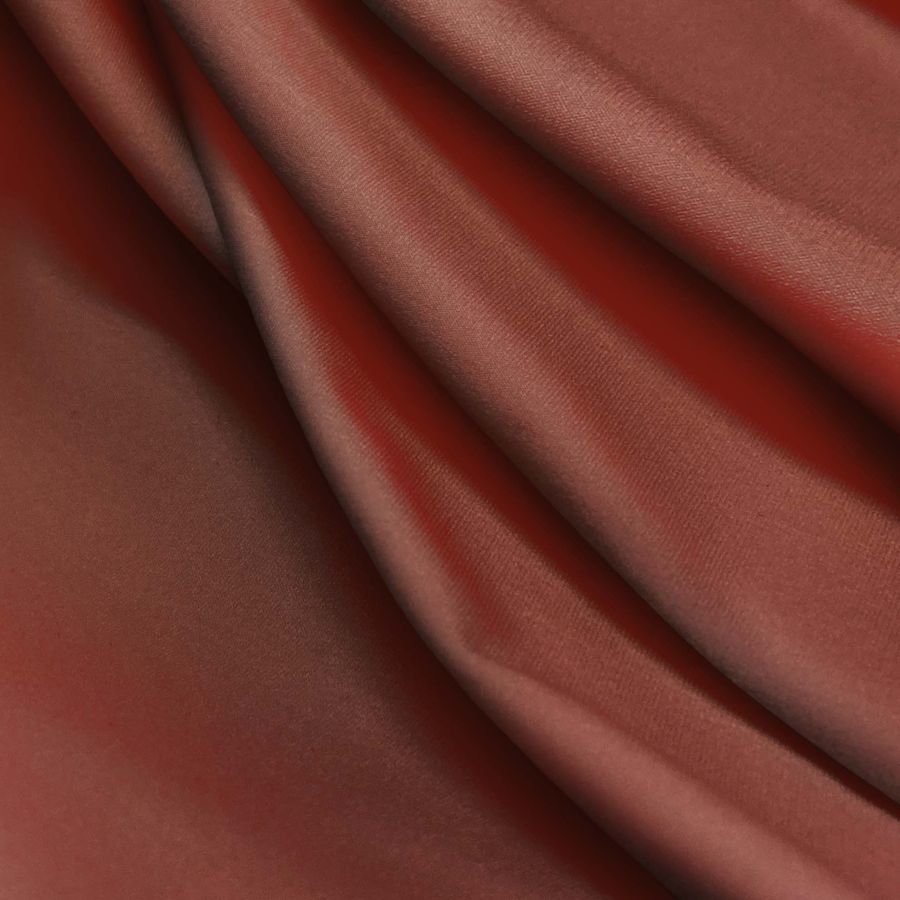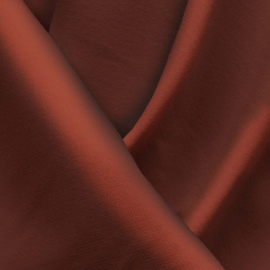La tela base es Lycra Reciclada - Seal de 230 gr/m2, compuesta por un 75% de poliéster y un 25% de elastano, con un gramaje de 230 gr/m2 y un ancho de tela de 150 cm. El color liso impreso es Marron o Caput Mortuum, con una combinación de tintas cian, magenta, amarillo y negro (CMYK) de 38 89 86 60 y un acabado mate. El color secundario se describe como un tono oscuro y terroso, que simboliza lo estable, la fiabilidad y la energía firme. Este color combina muy bien con tonos de beige, marrón claro y verde oliva.