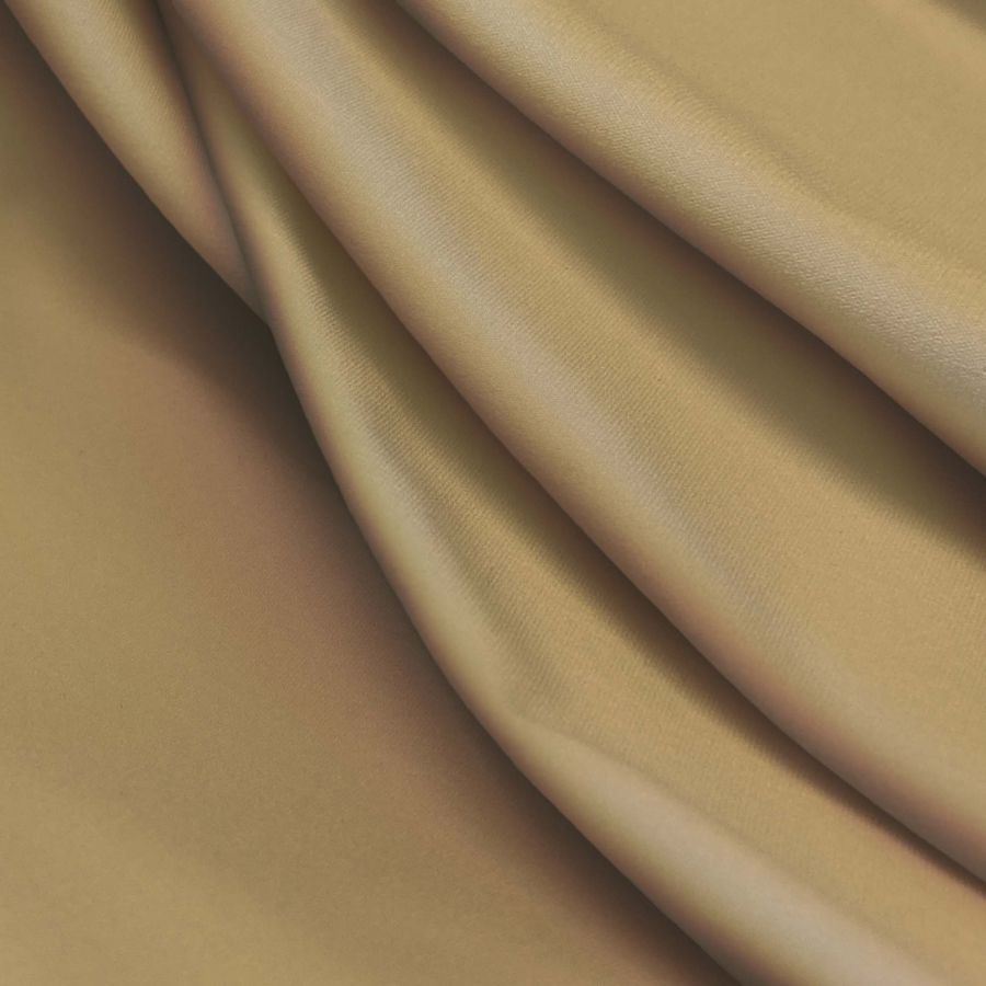 La tela base es la Lycra Reciclada - Seal de 230 gr/m2, compuesta por un 75% de poliéster y un 25% de elastano, con un gramaje de 230 gr/m2 y un ancho de 150 cm. La impresión lisa a una sola cara se realiza con la tinta CMYK 7 33 56 1, dando como resultado un color marrón caramelo. Este color es simbólico de la tierra y la naturaleza, transmitiendo sensaciones de calidez y estabilidad. Se combina especialmente bien con tonos cremosos, verdes oscuros y naranjas, generando una paleta de colores evocadora de paisajes naturales. Las características de la tela son su textura elástica, resistente al cloro y con protección UV muy alta de 50+.