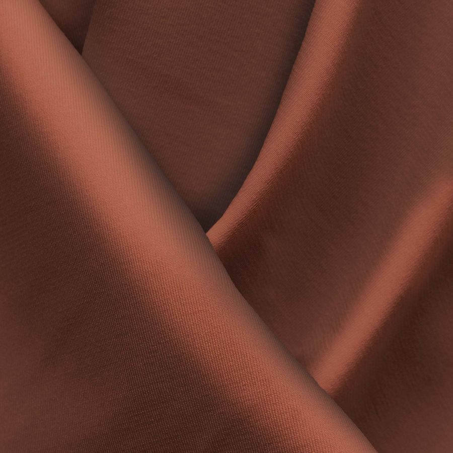 La tela base es Lycra Reciclada - Seal de 230 gr/m2, compuesta por un 75% de poliéster y un 25% de elastano, con un gramaje de 230 gr/m2 y una anchura de 150 cm. Su color liso impreso es marrón cedro, con un CMYK de 36 76 78 52. Este color en particular presenta una tonalidad intermedia entre el marrón y el rojizo, evocando a la naturaleza y transmitiendo calidez y elegancia. Combina especialmente bien con colores terrosos, beige, verdes, rojos oscuros y amarillos.