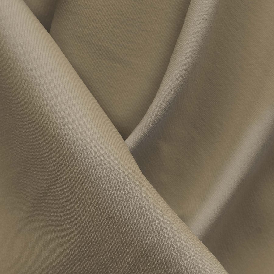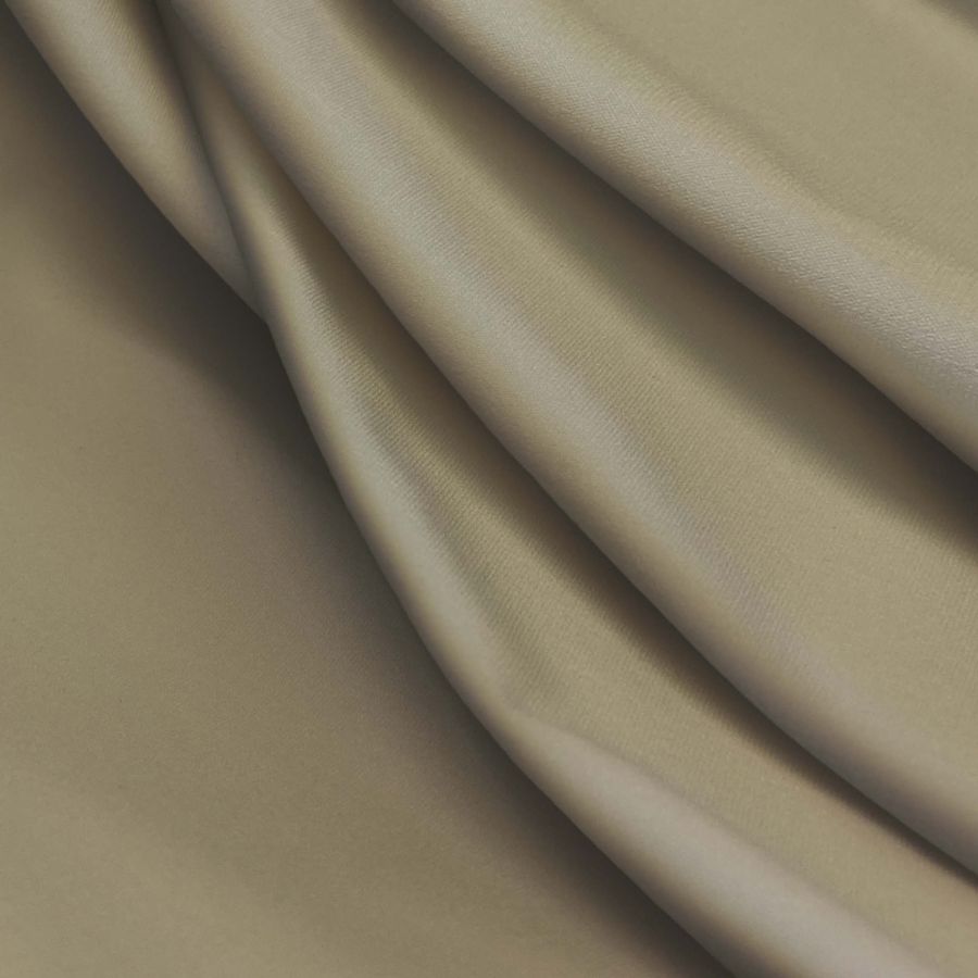 La tela base es la Lycra Reciclada - Seal de 230 gr/m2, compuesta por un 75% de poliéster y un 25% de elastano, con un gramaje de 230 gr/m2 y un ancho de 150 cm. Esta tela es ideal para aplicaciones en ropa deportiva, lencería y moda de baño debido a su capacidad elástica y su resistencia al cloro. El color liso impreso en esta tela es una combinación de marrón y verde caqui, con una mezcla de cian (25), magenta (27), amarillo (45) y negro (8), con un CMYK de 25 27 45 8. Este color secundario se asocia con la naturaleza, la tranquilidad y la paz, y combina perfectamente con otros colores naturales como beige, marrón, gris y blanco.