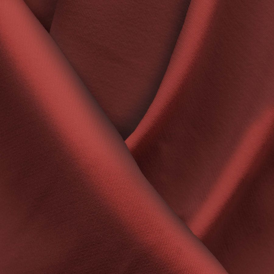 La tela base es Lycra Reciclada - Seal de 230 gr/m2 y el color liso impreso es marrón-granate con un CMYK de 35 93 82 55. Este color secundario único puede describirse como el resultado de mezclar el rojo oscuro y el marrón. Este color tiene un aspecto cálido y natural que se asocia típicamente con la temporada otoño-invierno. El marrón-granate puede combinarse con otros colores como el beige, el verde oscuro, el gris claro y el rosa claro para crear un paleta más amplia.