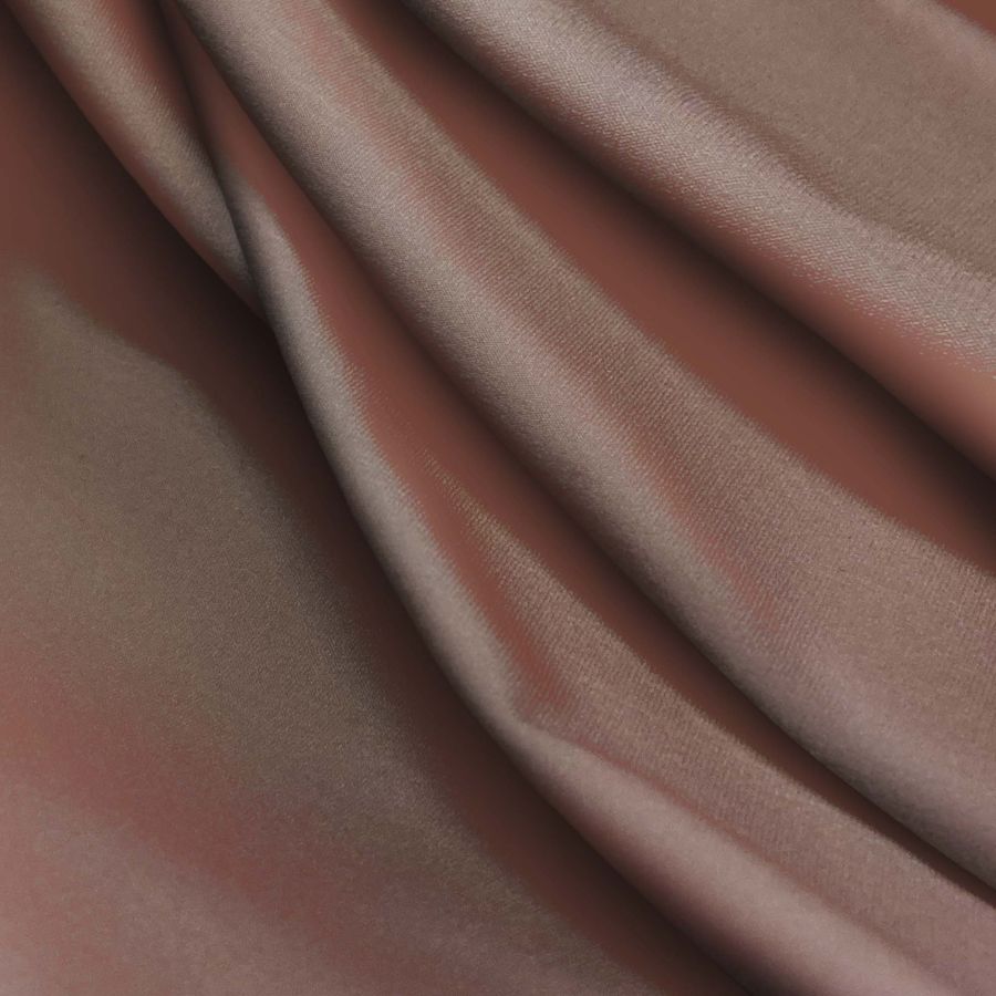 La tela base de este tejido se llama Lycra Reciclada - Seal, con una composición del 75% de poliéster y 25% de elastano. Su gramaje es de 230 gr/m2 y está certificado con la etiqueta GRS por su calidad por ser reciclado. El color liso impreso en este tejido es un marrón oscuro con un CMYK de 44 58 56 55. Este color tenía una combinación simbólica de seriedad y elegancia, pero también sensación de estar a la moda. Además, es un color que va muy bien con los tonos tierra y los colores pasteles.