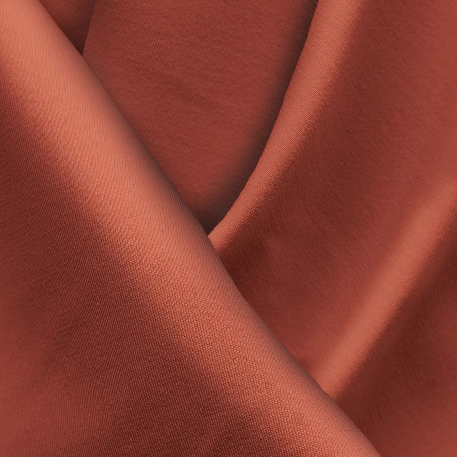 La tela base es una Lycra Reciclada - Seal de 230 gr/m2, compuesta por 75% POLIÉSTER y 25% ELASTANO y con un ancho de 150cm. El color liso impreso es un tono Marron-Rojo Pardusco con un CMYK de 26 83 81 21. Este color secundario es cálido y terroso, y combina bien con tonos neutros y tierra como beige, marrón y verde, pero también puede ser contrastado con un amarillo brillante o un rosa vívido.