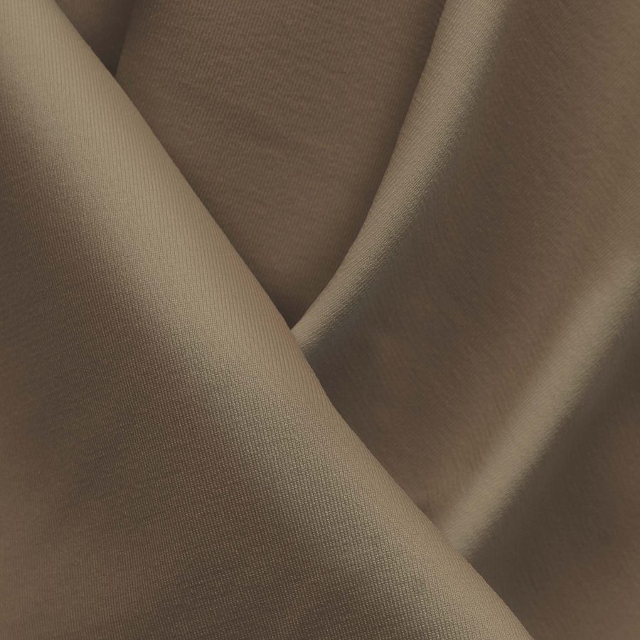 La tela base es Lycra Reciclada - Seal de 230 gr/m2 compuesta por 75% poliéster y 25% elastano, con un gramaje de 230 gr/m2 y un ancho de 150 cm. El color liso impreso es marrón sándalo, con un CMYK de 32 39 52 21. El color secundario es un marrón oscuro con toques rojizos, que aporta un aspecto natural y cálido a la tela. Combina muy bien con otros colores terrosos, verde oliva, blanco y negro. El tejido está impreso con el color liso a una sola cara por impresión digital textil, por lo que la otra cara permanece sin impresión.