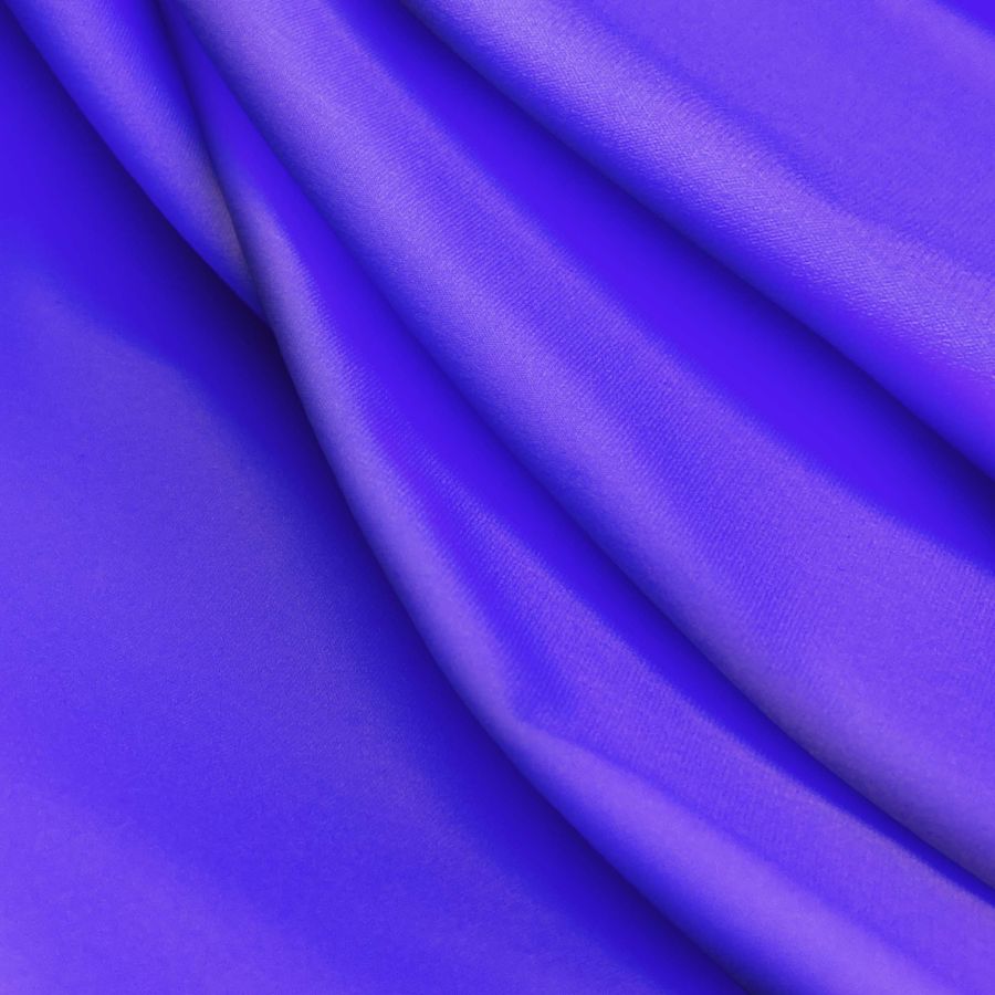 La tela base, Lycra Reciclada - Seal de 230 gr/m2, es un tejido elástico y suave, compuesto por un 75% de poliéster y un 25% de elastano, con un gramaje de 230 gr/m2 y un ancho de 150 cm. El color liso impreso en esta tela es Morado/Azul Violáceo y su CMYK se compone de 87 de tinta Cyan y 83 de tinta Magenta, resultando en un tono violeta profundo y vibrante. Este color secundario combina armoniosamente con tonos rosa, lila, verde oliva y gris.