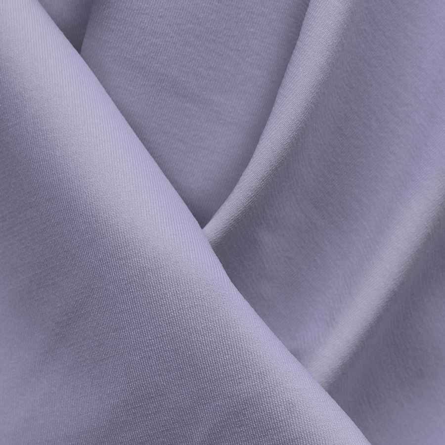Esta es la tela Lycra Reciclada - Seal de 230 gr/m2, cuyo color liso impreso es de un tono morado jabón con un CMYK de 22 23 0 0. Este color secundario es muy versátil, ya que puede combinarse con tonos pastel, grises y tierras, dando un toque suave y elegante.