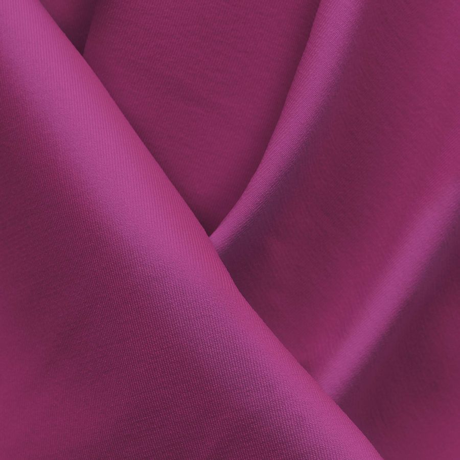 La tela base es Lycra Reciclada - Seal de 230 gr/m2 en color liso impreso en morado-morera, con un CMYK de 23 82 10 0. El morado-morera es un color secundario que simboliza la creatividad, la sabiduría y la sofisticación. Técnicamente, es un tono híbrido entre el púrpura y el rosa que combina con tonos claros como el beige, el blanco, el rosa claro y con tonos oscuros como el negro, el gris y el marrón. Este tejido está impreso a una sola cara por impresión digital textil, lo que significa que el dibujo o diseño se imprime en la parte exterior de la tela, no se trata de un tejido tintado.
