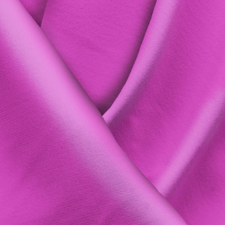 La tela base es Lycra Reciclada - Seal de 230 gr/m2, una tela elástica compuesta por 75% de poliéster y 25% de elastano. Tiene un gramaje de 230 gr/m2 y un ancho de 150 cm. El color liso impreso es un morado vibrante con dinamismo, cuyo CMYK es 24 72 0 0 y está impreso a una sola cara por impresión digital textil. Este color secundario se simboliza con la creatividad, la imaginación y la originalidad, y se combina particularmente bien con tonos de verde y rosa.