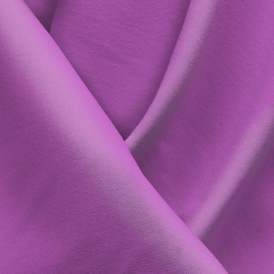 La tela base de este tejido es la Lycra Reciclada - Seal de 230 gr/m2, compuesta por un 75% de poliéster y un 25% de elastano. Su color liso impreso es morado/violeta web, indicado por un CMYK de 25 55 0 0 y es impreso a una sola cara por impresión digital textil. Esta combinación de colores secundarios ofrece un tono vibrante y sofisticado que armoniza muy bien con colores como el blanco, el negro y tonos de rosa y azul.