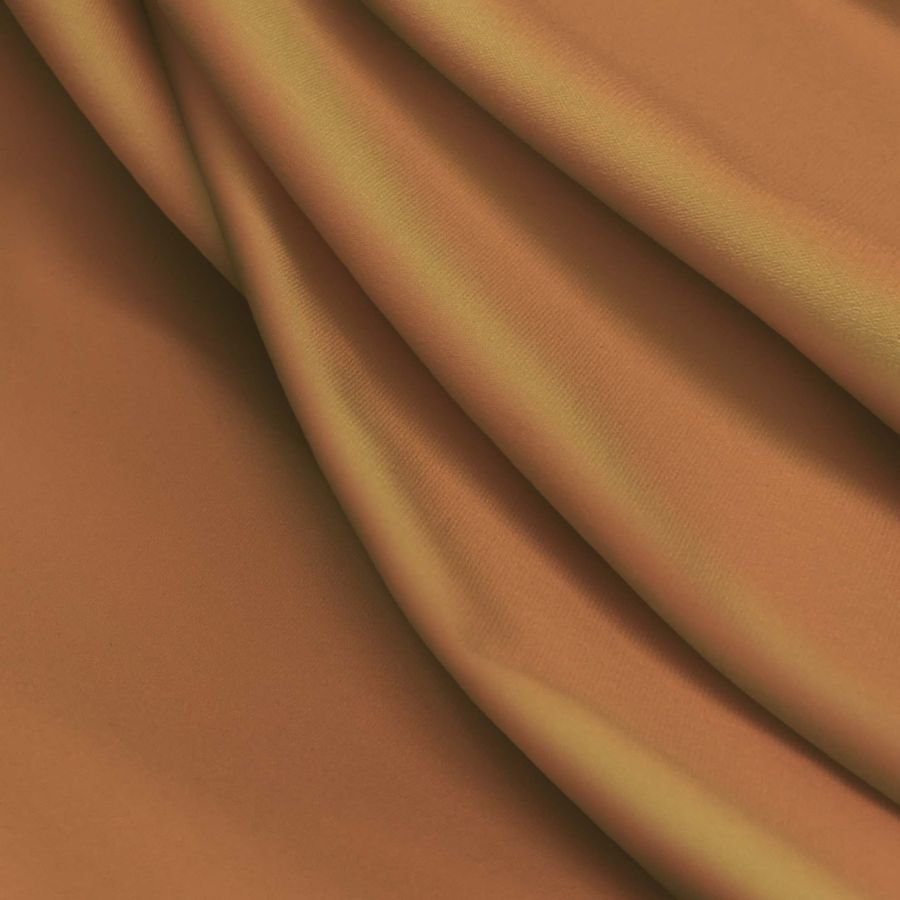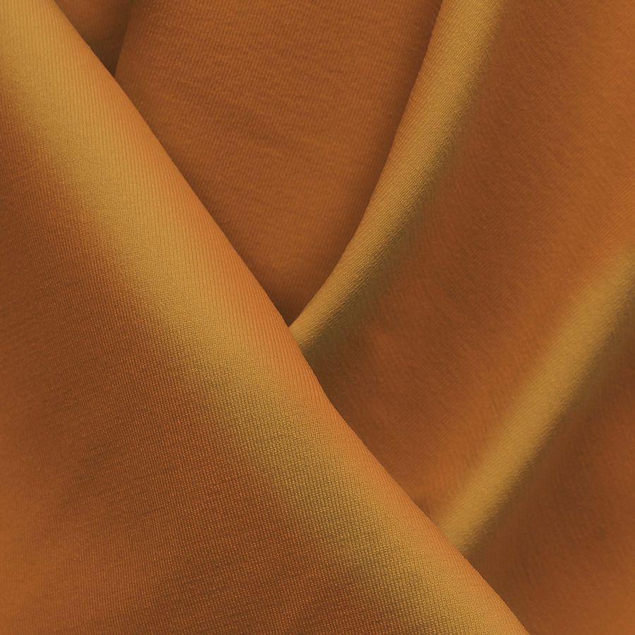 La tela base es una Lycra Reciclada - Seal de 230 gr/m2 compuesta por un 75% de poliéster y un 25% de elastano, con una anchura de 150 cm. El color liso impreso es un Naranja Caléndula con un código CMYK de 8 55 80 1. Representa la energía del sol, transmitiendo vitalidad y optimismo. Este color combina muy bien con tonos de beige suave, marrones cálidos y blancos naturales.