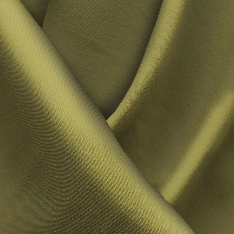 La tela base es Lycra Reciclada - Seal de 230 gr/m2, compuesta por 75% poliéster y 25% elastano con un gramaje de 230 gr/m2 y un ancho de 150 cm. El color liso impreso es Verde Oliva Oscuro, con una composición de tintas Cyan: 52, Magenta: 42, Yellow: 86 y Black: 35, representados en el perfil de color CMYK: 52 42 86 35. El color transmite una sensación de naturaleza, frescura, vitalidad y elegancia. Combina perfectamente con colores neutros, como los distintos tonos de beige, marrón y negro.