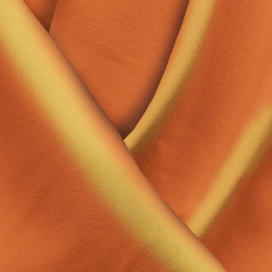 La tela base es la Lycra Reciclada - Seal de 230 gr/m2, compuesta por 75% poliéster y 25% elastano. El color liso impreso es Amarillo Indio, con un CMYK de 0 65 82 0, lo que resulta en un vibrante amarillo con matices naranjas. Este color secundario simboliza la alegría y la vitalidad, y es perfecto para prendas deportivas y de baño. Combina muy bien con otros colores brillantes, como el turquesa y el magenta.