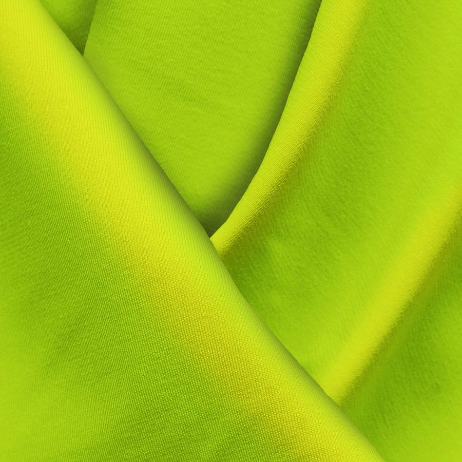 La tela base es la Lycra Reciclada - Seal de 230 gr/m2, de composición 75% POLIÉSTER y 25% ELASTANO, con una medida de 150 cm de ancho. El color liso impreso es de un vibrante verde pistacho con un CMYK de 35 0 100 0, impreso a una sola cara por impresión digital textil. Esta tela presenta una textura suave y elástica, con un acabado resistente al cloro y un factor de protección UV muy alta (50+). Además, posee la certificación GRS y es sostenible al estar hecha de materiales reciclados.