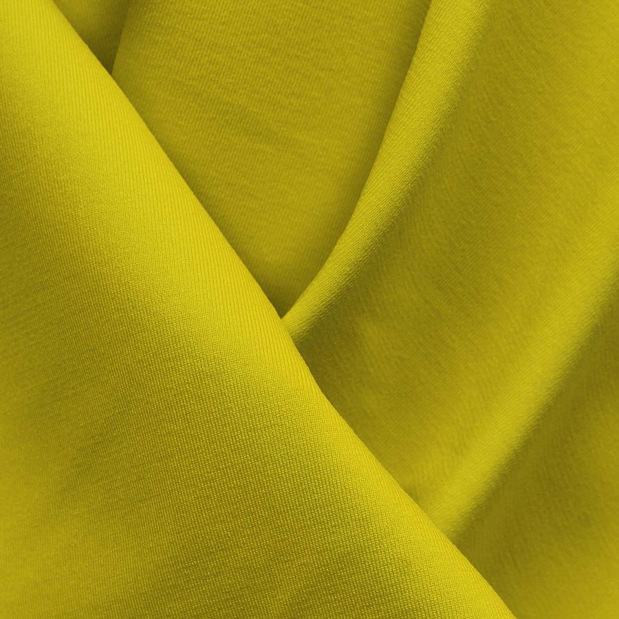 La tela base es Lycra Reciclada - Seal de 230 gr/m2 de compuestos 75% POLIÉSTER y 25% ELASTANO. El color liso impreso es Amarillo, con un CMYK de 3 2 88 0. Este color representa la fuerte energía del sol y del verano, y simboliza alegría y optimismo. También se asocia con la creatividad y la inteligencia.