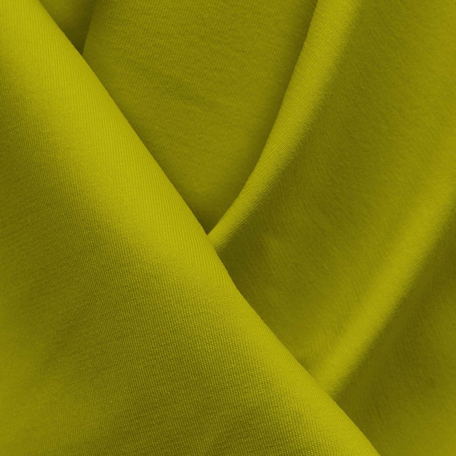 La tela base es Lycra Reciclada - Seal de 230 gr/m2, compuesta por un 75% de poliéster y un 25% de elastano. Presenta una textura elástica y suave al tacto, con un acabado resistente al cloro y un factor de protección UV muy alto de 50+. El color liso impreso en la tela es un amarillo sucio, con una combinación de tintas CMYK de 26 Cyan, 12 Magenta, 97 Yellow y 1 Black.