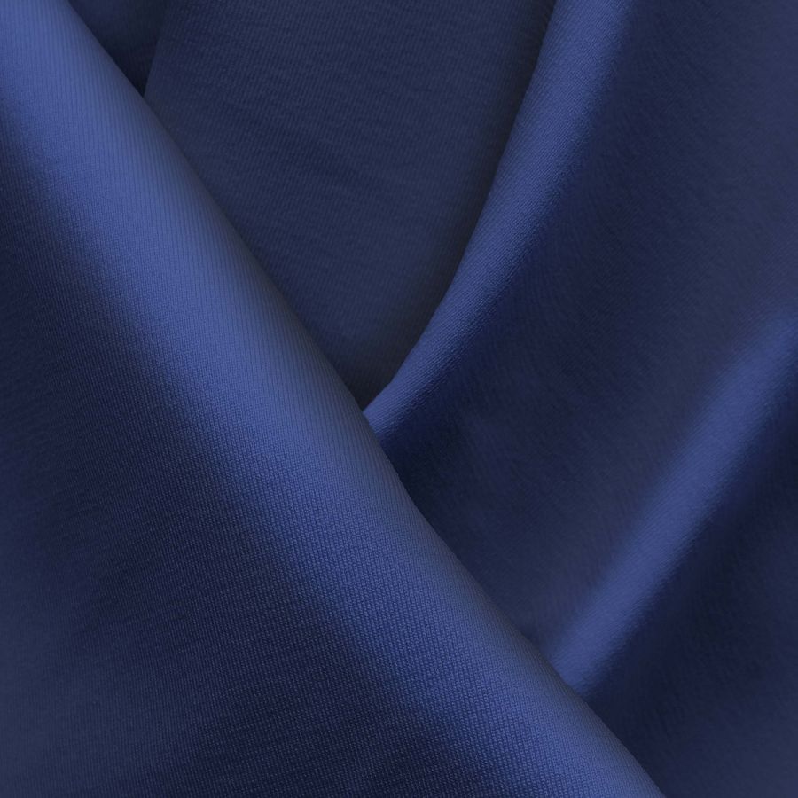 La tela base es la Lycra Reciclada - Seal de 230 gr/m2, con una composición de 75% poliéster y 25% elastano. El color liso impreso es un tono de azul profundo, con un contenido de cyan de 100, magenta de 88, yellow de 38 y black de 35 en el CMYK. Este color se combina genialmente con tonos verdes y grises, creando una combinación de colores elegante y sofisticada. El tejido está impreso con el color liso a una sola cara por impresión digital textil, lo que significa que el color solo está presente en un lado del tejido.