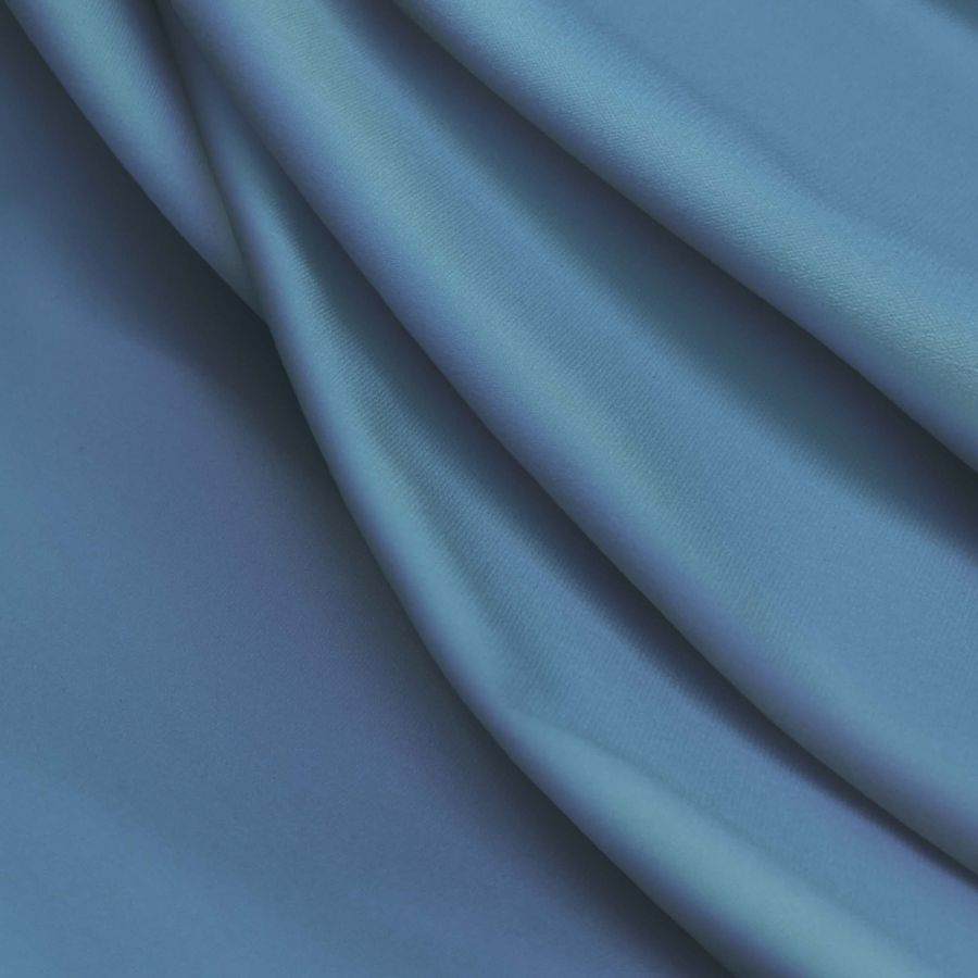 La tela base es la Lycra Reciclada - Seal de 230 gr/m2, con una composición de 75% POLIÉSTER y 25% ELASTANO en un gramaje de 230 gr/m2. El color de la tela lisa impresa es Azul Acero, cuya tinta Cyan es de 64, la Magenta es de 32, la Yellow es de 4 y la Black es de 0 en el modelo de color CMYK. Este color presenta una tonalidad fría y profunda que evoca la fuerza, la estabilidad y la duración. Combinado con otros colores cristalinos como el blanco y el plateado, refleja un sentido sofisticado de la elegancia.