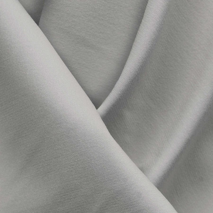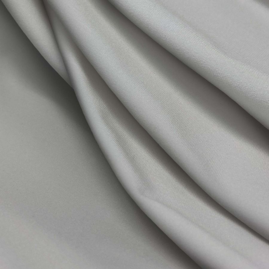 La tela base es Lycra Reciclada - Seal de 230 gr/m2, una lycra compuesta por 75% de poliéster y 25% de elastano, con una textura elástica y un acabado resistente al cloro y con un factor de protección UV muy alto de 50+. El color liso impreso es una combinación de blanco y platino con un CMYK de 12 9 11 0. Este color secundario es un tono plateado sutil que se puede combinar bien con otros colores fríos como el azul y el gris.