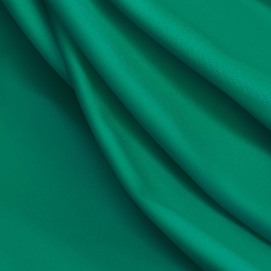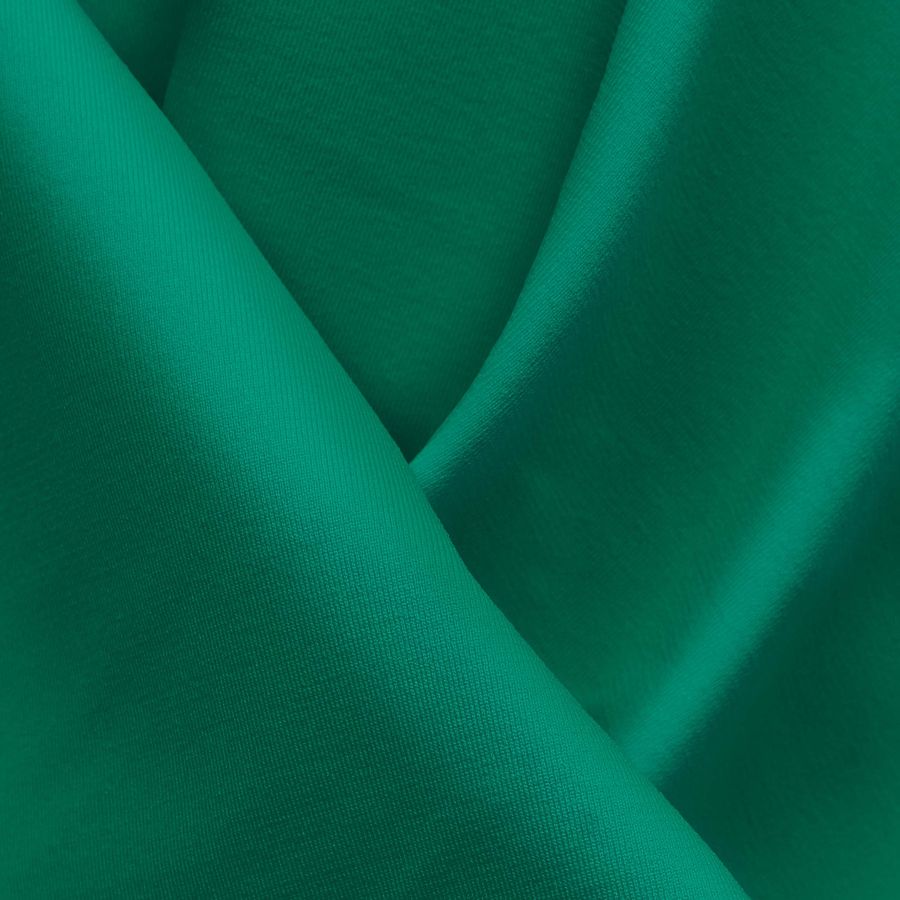 La tela base de este tejido es Lycra Reciclada - Seal de 230 gr/m2 con una composición de 75% poliéster y 25% elastano, y un ancho de 150 cm. El color liso impreso es verde esmeralda con un CMYK de 81 13 65 1, lo que se traduce en un tono intenso y vibrante. Este color combina perfectamente con otros verdes más claros o amarillos y dorados.