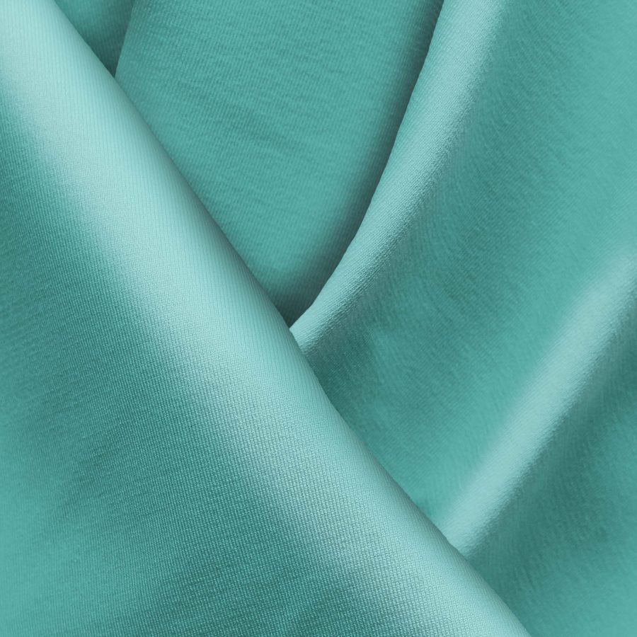 La tela base de este tejido es la Lycra Reciclada - Seal de 230 gr/m2, compuesta por un 75% de poliéster y un 25% de elastano, con un gramaje de 230 gr/m2 y ancho de 150 cm. El color liso impreso es verde turquesa, con una combinación CMYK de 62 0 33 0. Este atractivo color secundario evoca la naturaleza y la serenidad del mar. Combinado con blanco o negro, aporta un carácter sobrio y elegante; mientras que, junto a tonos rosas o corales, crea una mezcla fresca y vibrante.