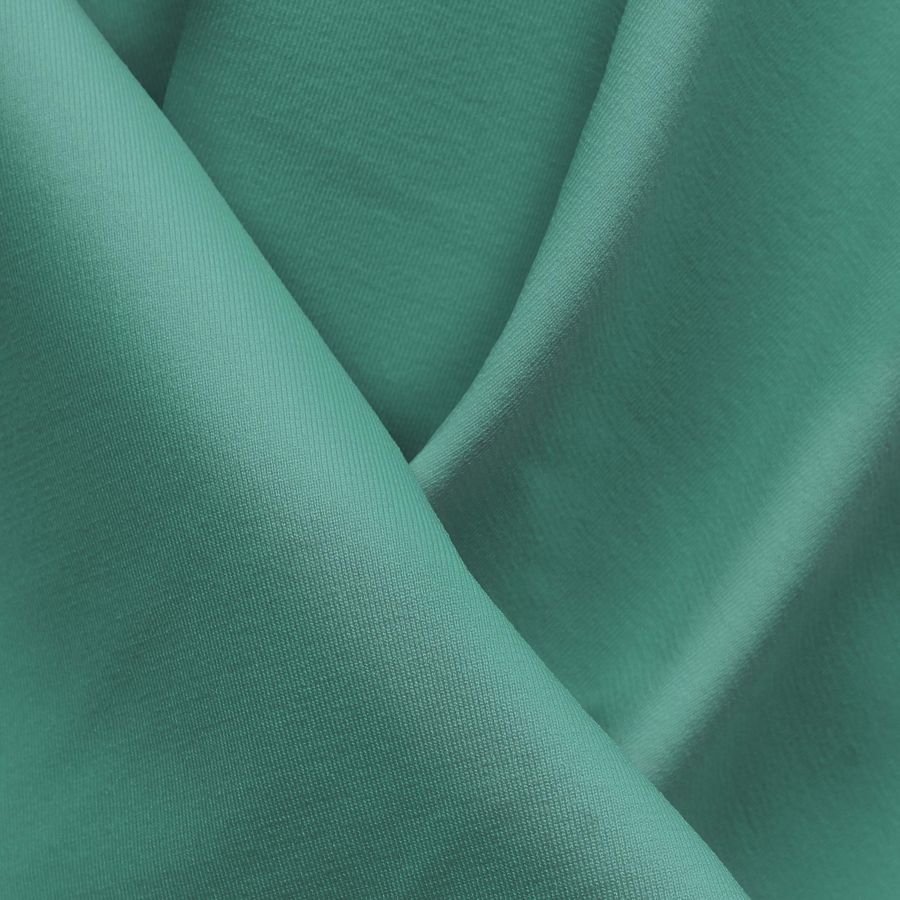 La tela base es la Lycra Reciclada - Seal de 230 gr/m2, compuesta por un 75% de poliéster y un 25% de elastano. Esta tela se presenta en un color liso impreso de tonalidad verde cardenillo, cuyo CMYK es 59 0 39 0, en el que predominan los tonos verdes y marrones, transmitiendo sensación de tranquilidad y calidez. El color verde cardenillo, por su naturaleza terrosa y natural, se asocia con un estilo de vida más ecológico y sostenible. Este color liso impreso combina perfectamente con tonos marrones, cremas, tonalidades de verde y amarillos.